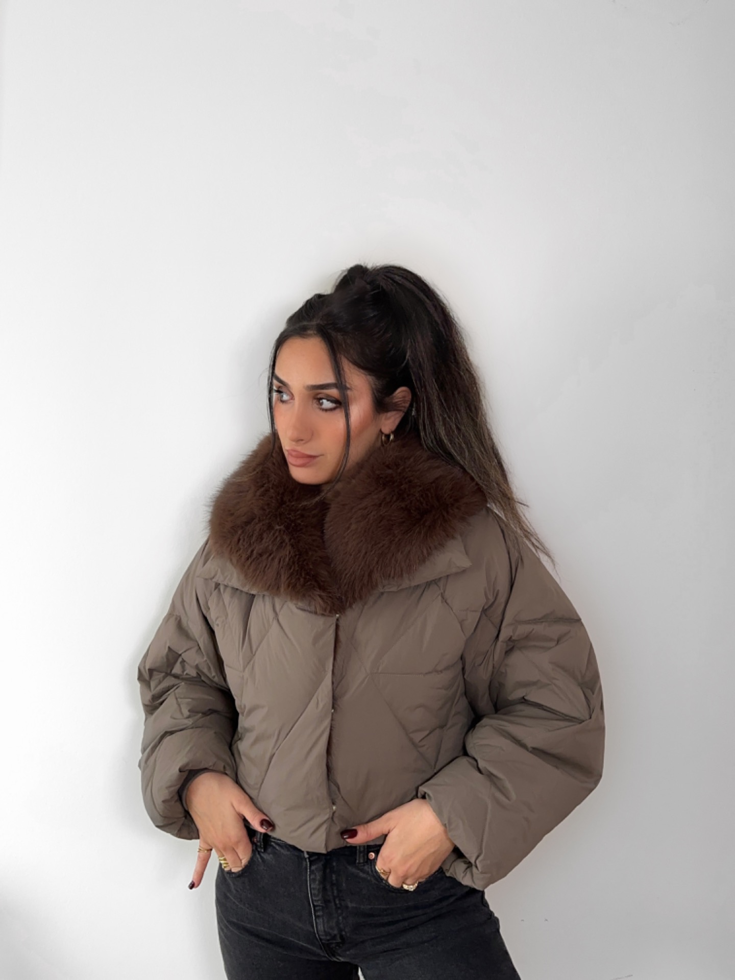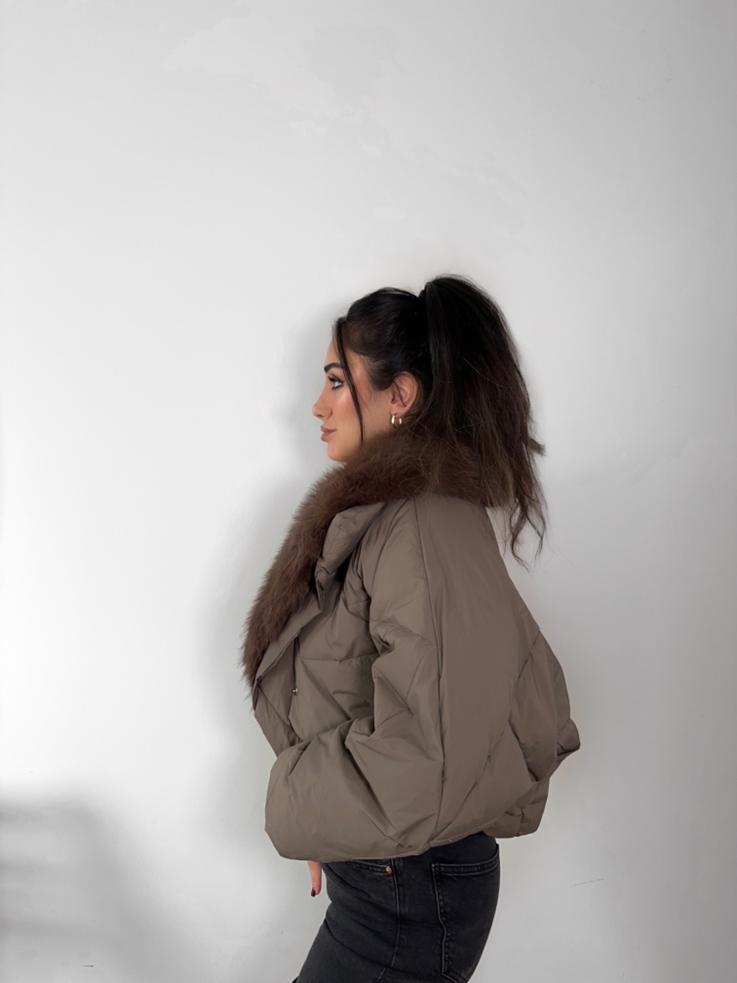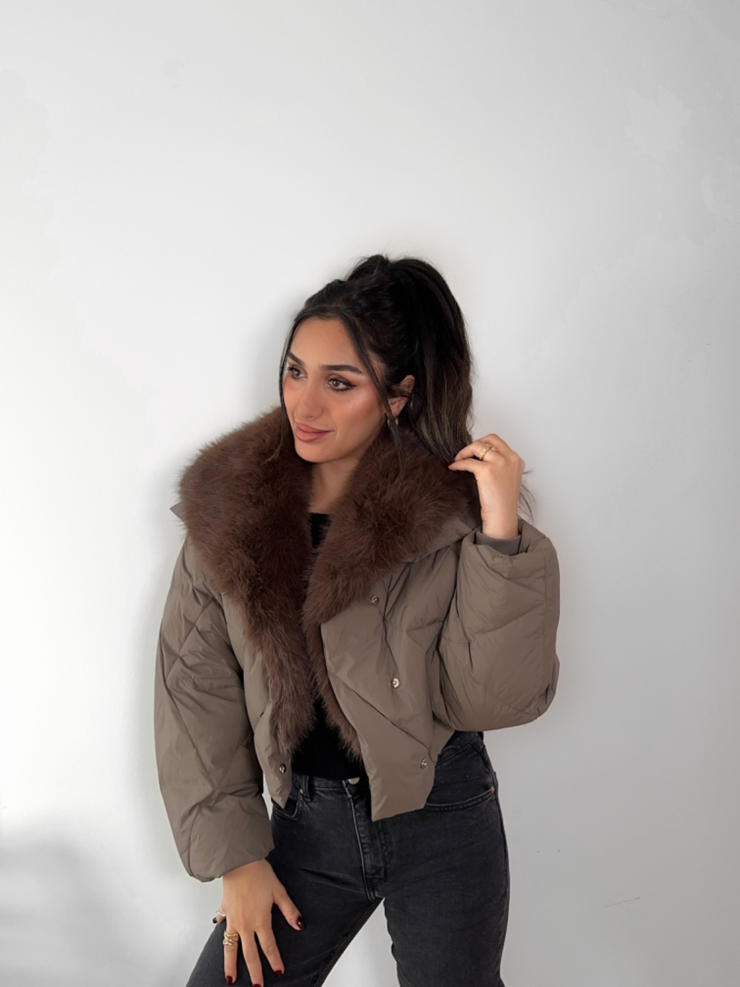 En trendy dunjakke med pels der kombinerer stil og funktionalitet på en luksuriøs måde. Jakken er fyldt med let og varm dun, der sikrer komfort på kolde dage uden at føles tung.