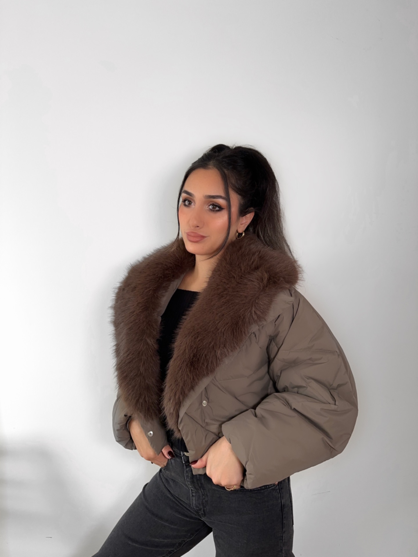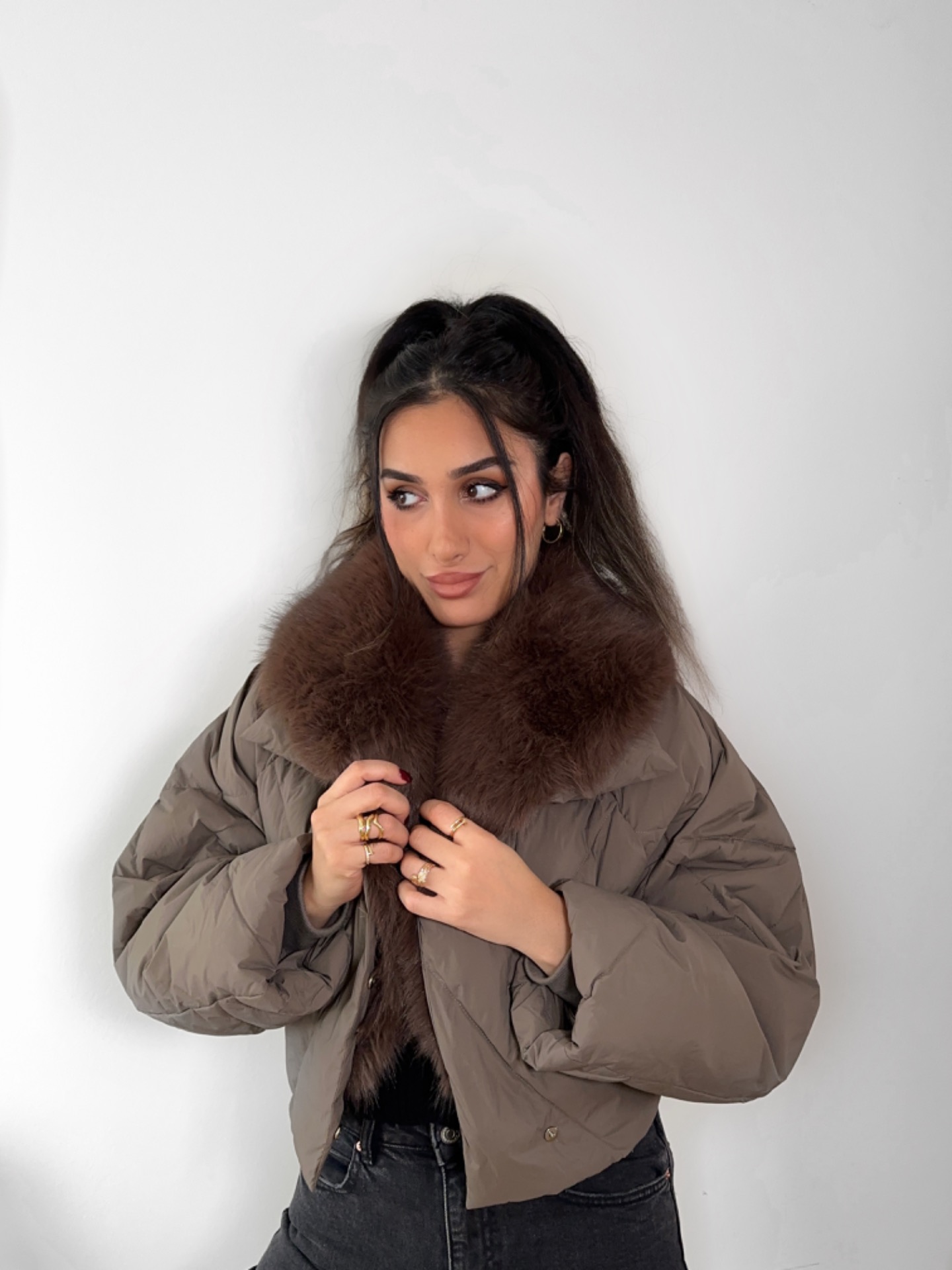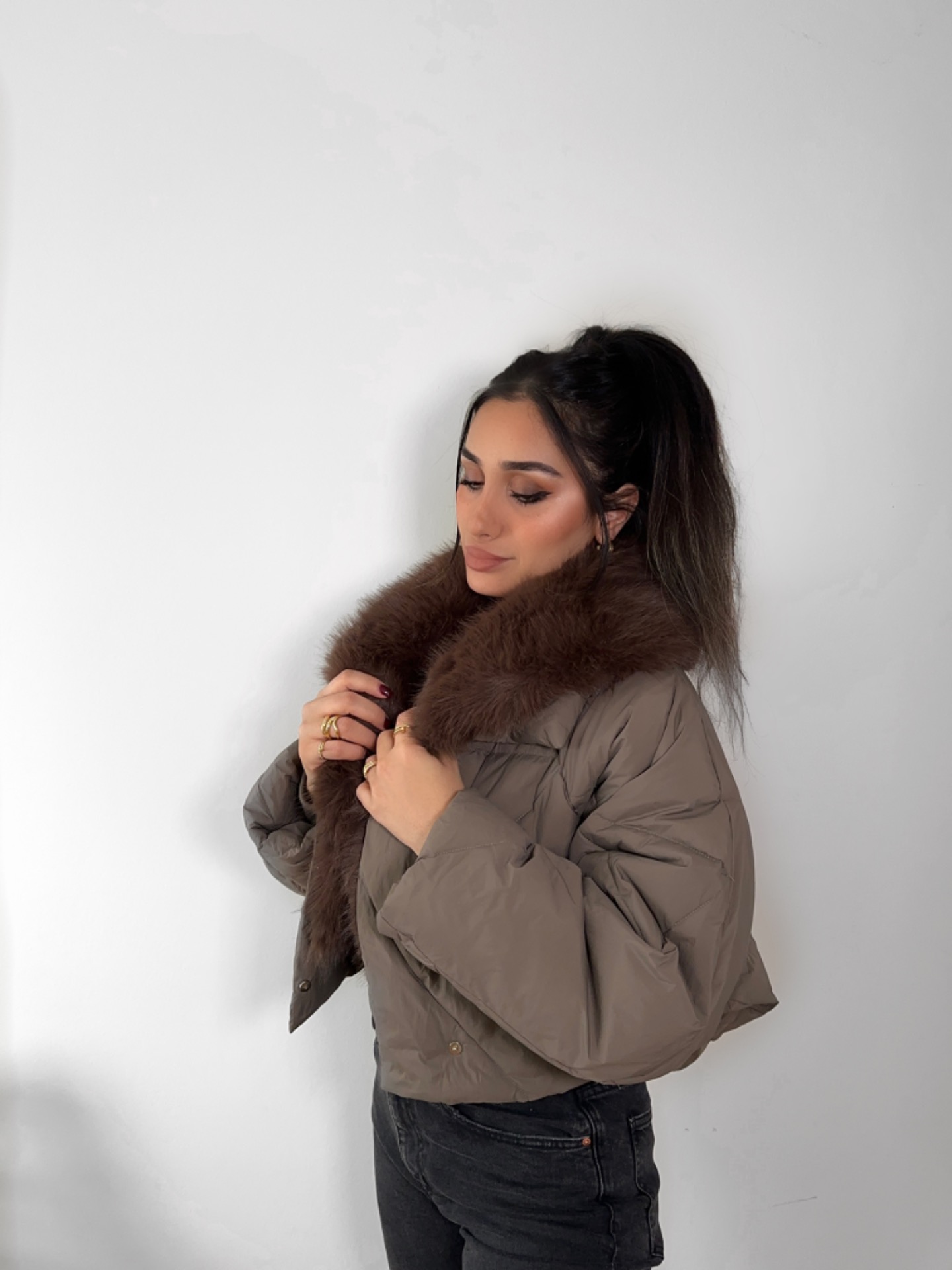 En trendy dunjakke med pels der kombinerer stil og funktionalitet på en luksuriøs måde. Jakken er fyldt med let og varm dun, der sikrer komfort på kolde dage uden at føles tung.